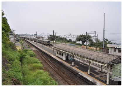 根府川駅ホーム。駅舎よりも下に位置しています。